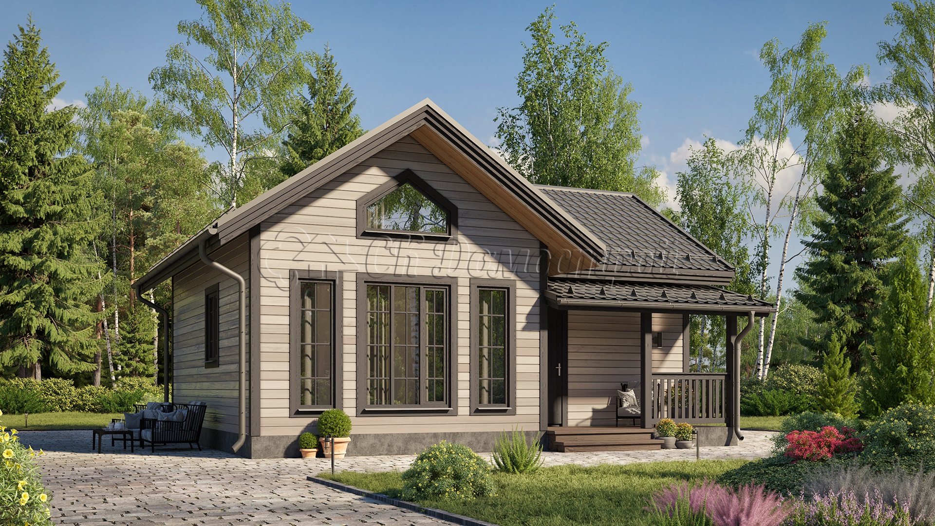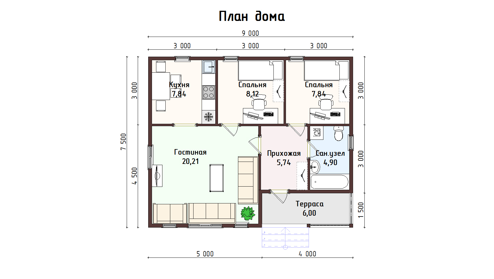 Размер коттеджа 7.5х9 метра, а общая жилая площадь равняется 62 квадратным метрам.