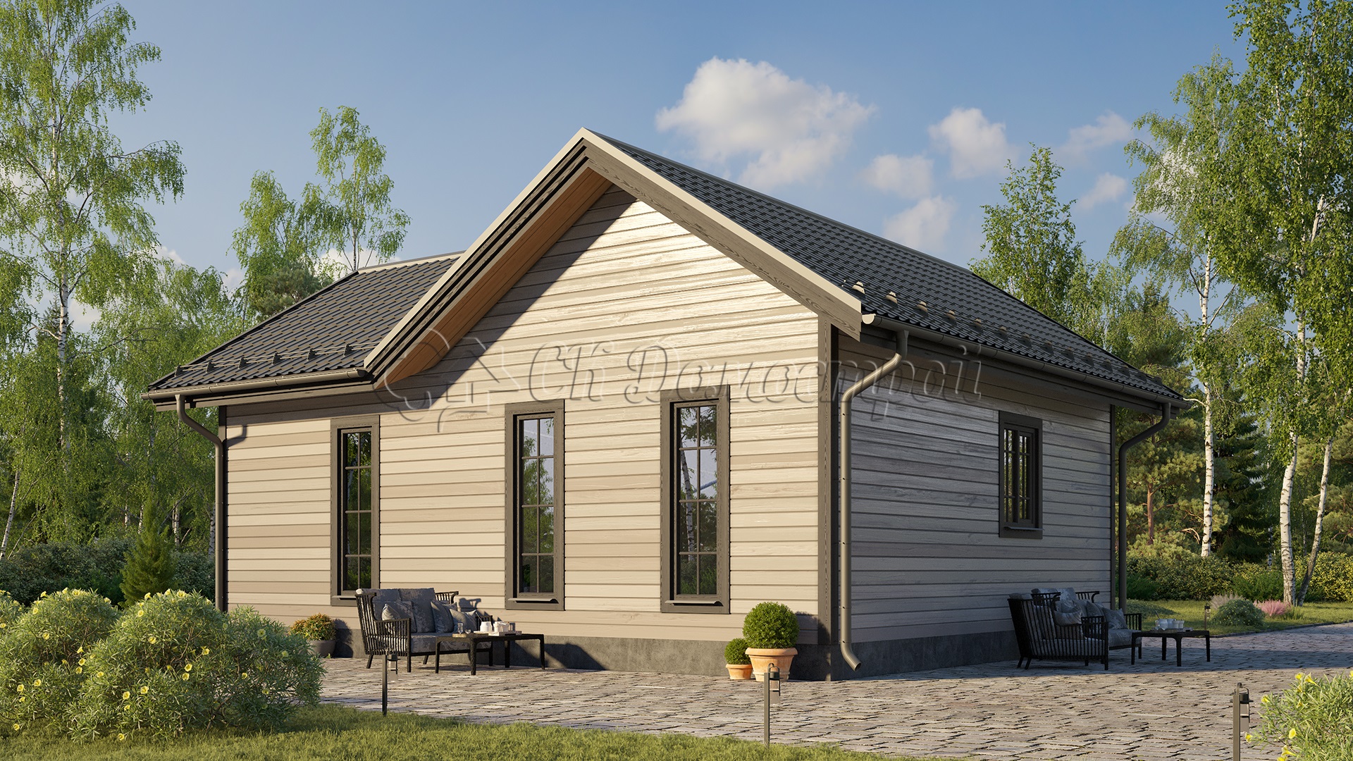 Каркасный дом «Давыдов» представляет собой современную приусадебную постройку, лучше всего подходящую для молодой семейной пары без детей. Из-за конструктивных особенностей коттеджа дополнительное утепление не предусмотрено, и постройка не предназначается для использования в холодное время года.