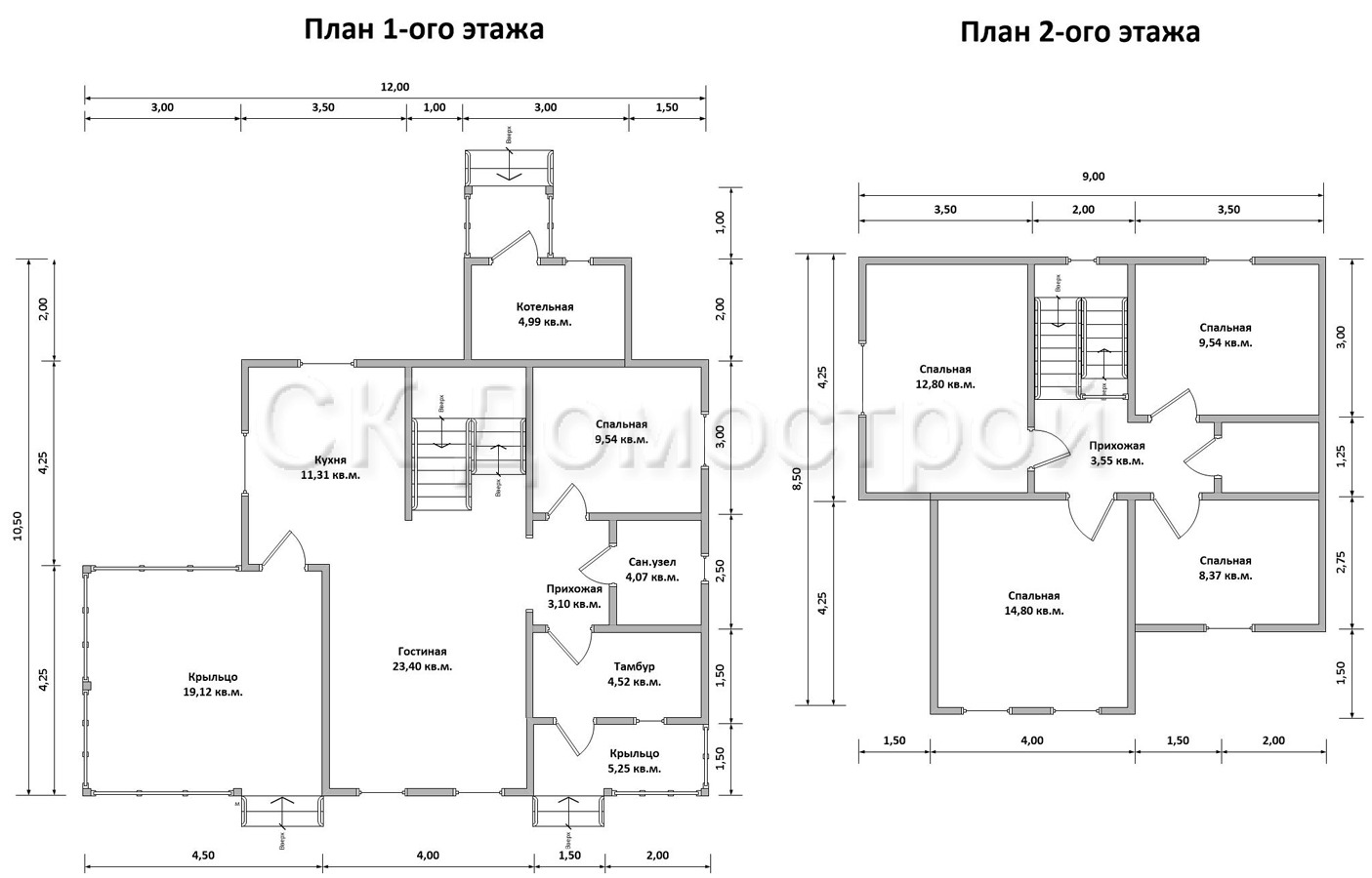 В загородном доме «Елизаров» два полноценных этажа, а планировка разработана таким образом, чтобы все члены семьи чувствовали себя свободно и комфортно. На первом этаже имеется гостиная, кухня, небольшая спальня, котельная, прихожая, санузел и два крыльца, одно из которых закрыто крышей. На втором этаже четыре спальных комнаты разного размера и прихожая.