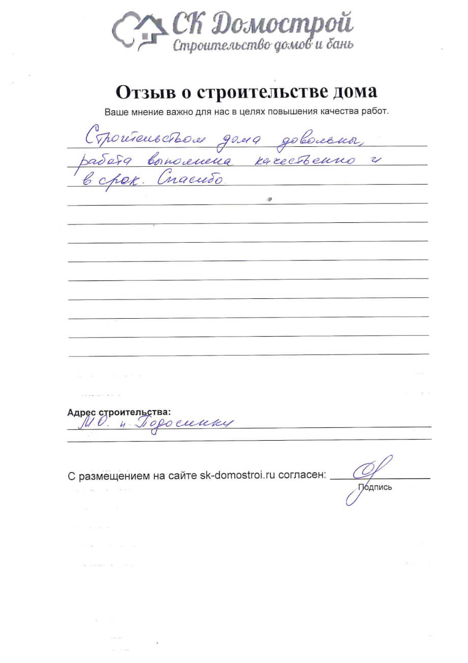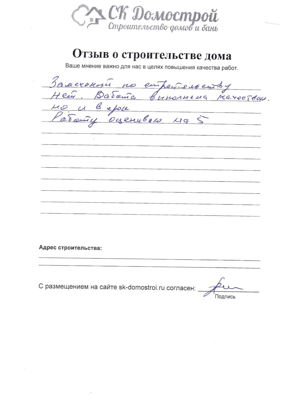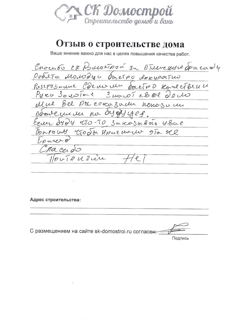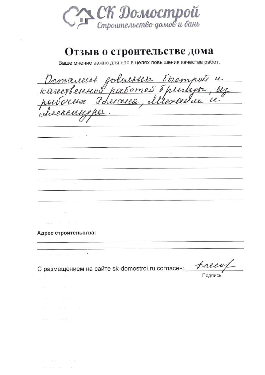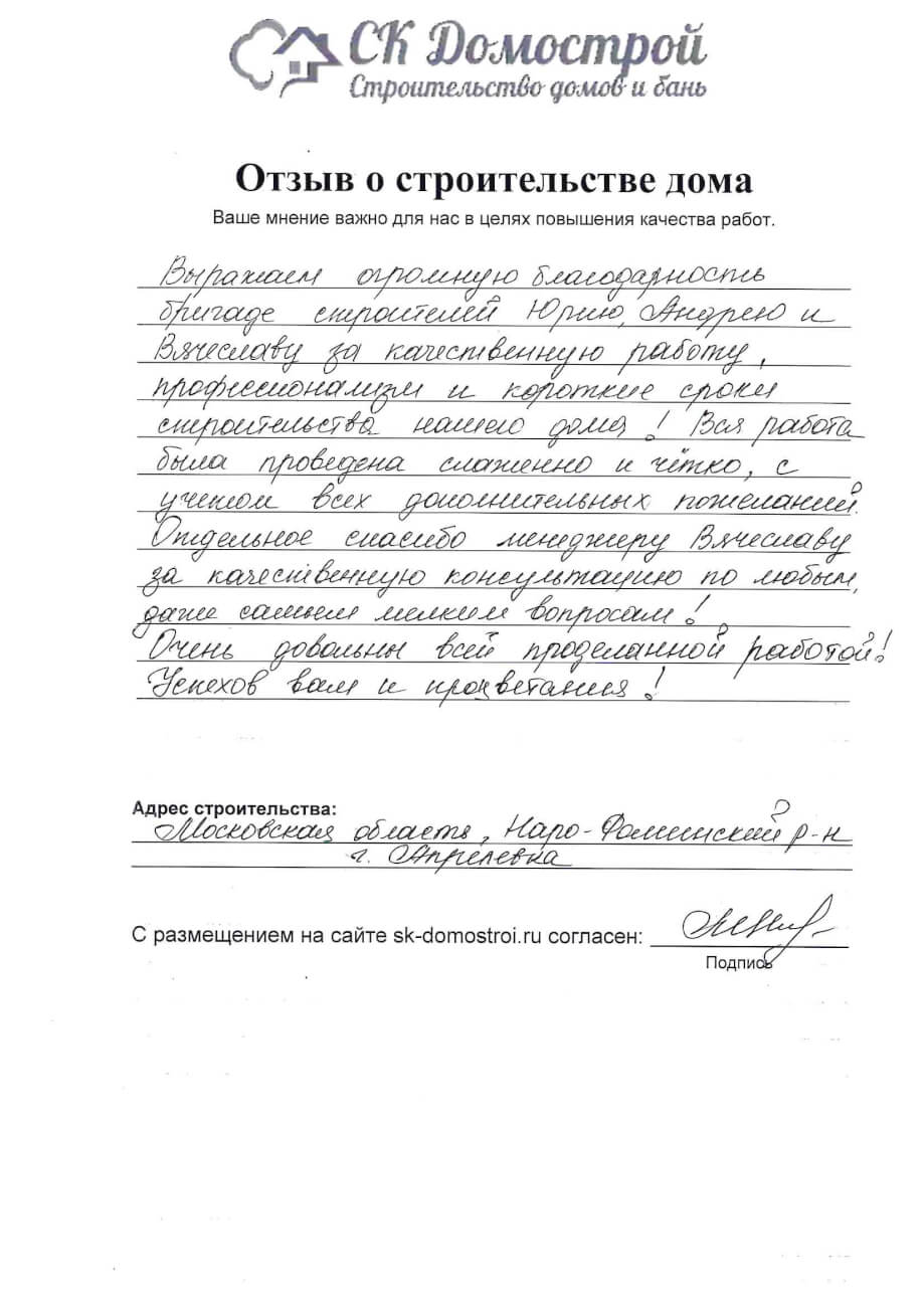 “Выражаем огромную благодарность бригаде строителей Юрию, Андрею и Вячеславу за качественную работу, профессионализм и короткие сроки строительства нашего дома! Вся работа была проведена слаженно и четко, с учетом всех дополнительных пожеланий. Отдельное спасибо менеджеру Вячеславу за качественную консультацию по любым даже самым мелким вопросам! Очень довольны всей проделанной работой! Успехов вам и процветания!”