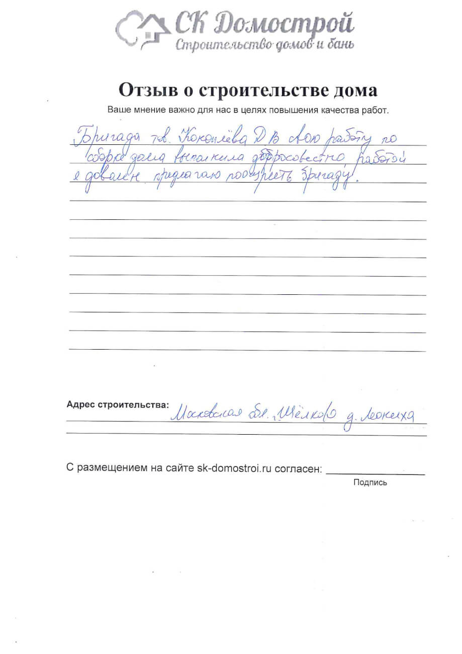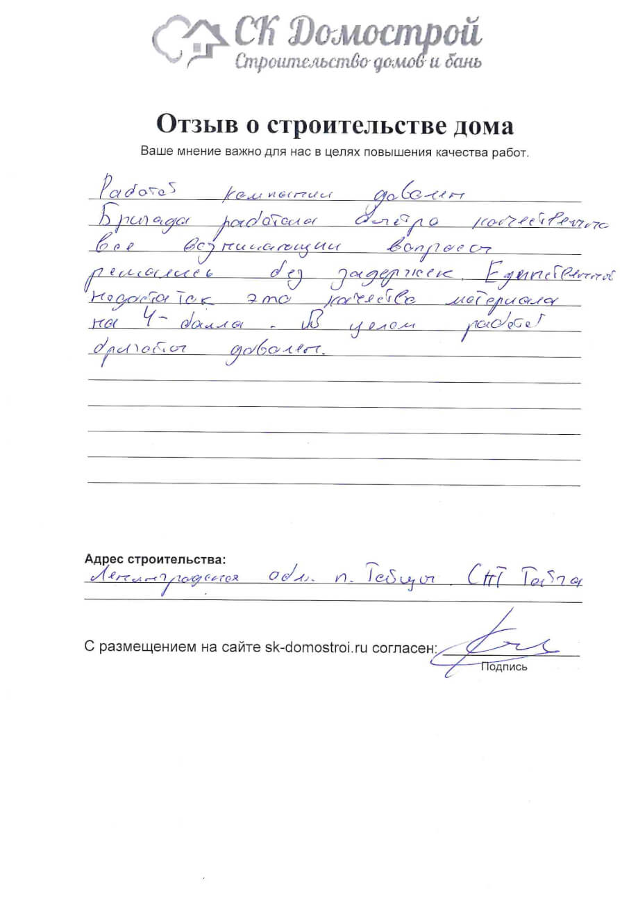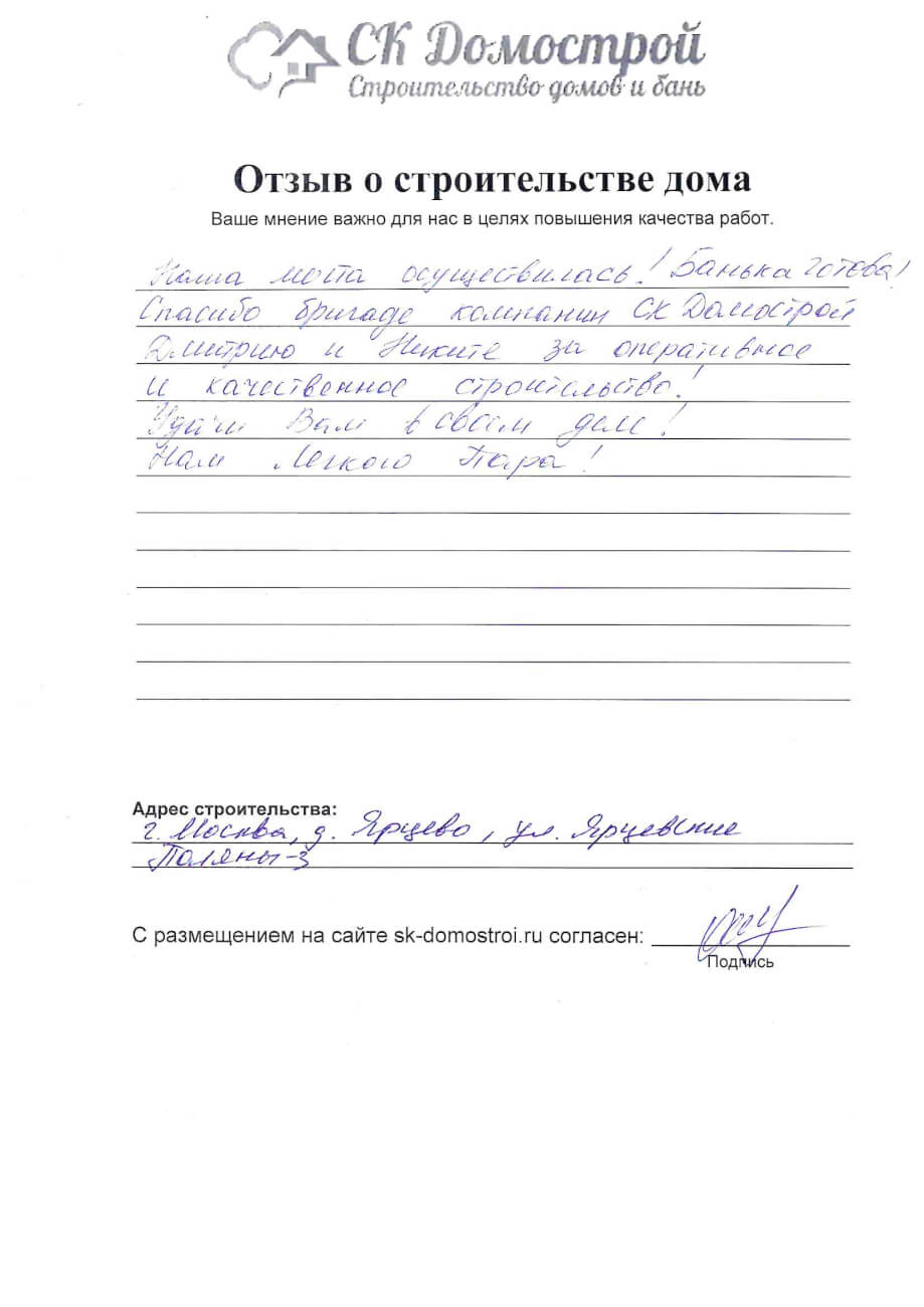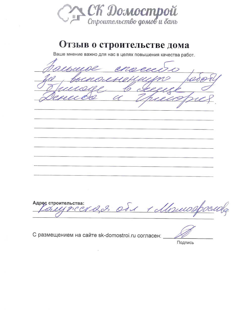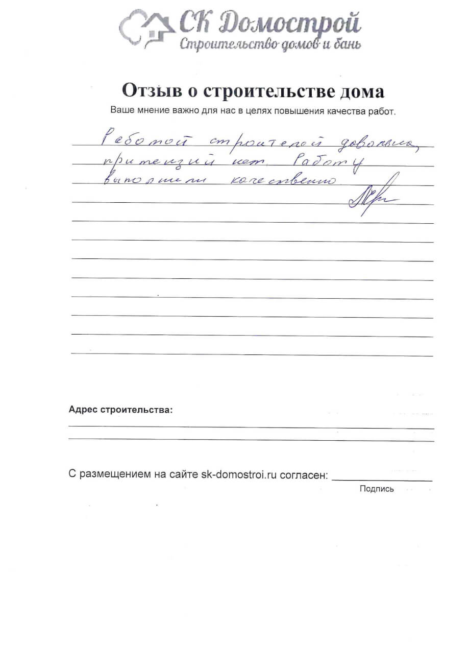 “Выражаем огромную благодарность бригаде строителей Юрию, Андрею и Вячеславу за качественную работу, профессионализм и короткие сроки строительства нашего дома! Вся работа была проведена слаженно и четко, с учетом всех дополнительных пожеланий. Отдельное спасибо менеджеру Вячеславу за качественную консультацию по любым даже самым мелким вопросам! Очень довольны всей проделанной работой! Успехов вам и процветания!”