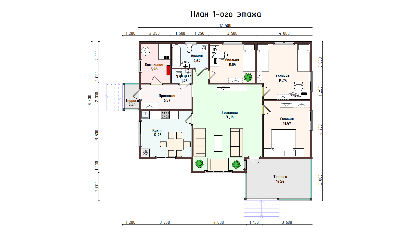 В состав дома входит три спальных комнаты большого размера, гостиная, кухня, душевая, пара небольших кладовок и крытая терраса. Имеется и котельная, в которой устанавливается отопительное оборудование.